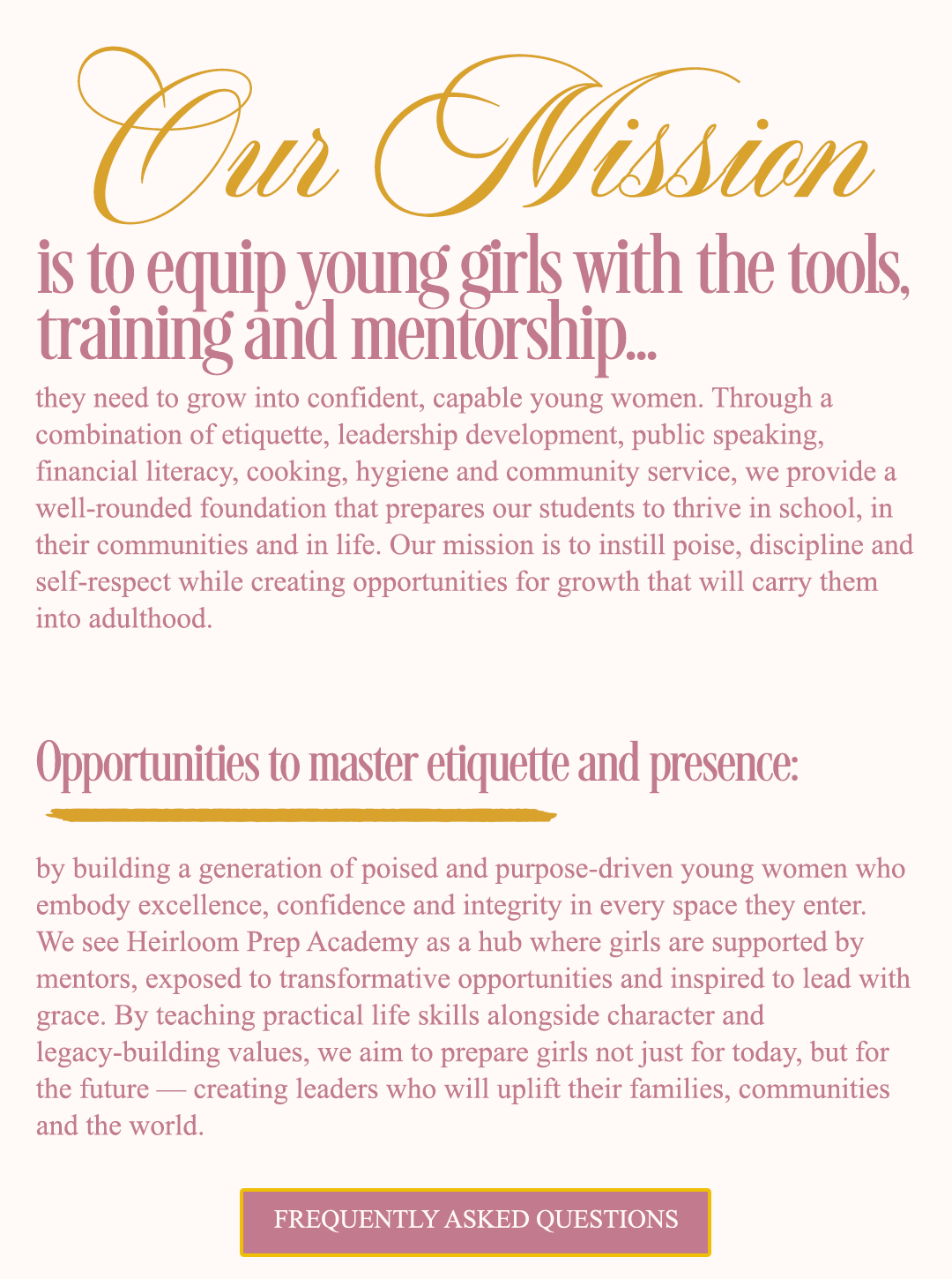 Heirloom Prep Academy is open to girls ages 5–18, with tailored activities for elementary, middle and high school students.